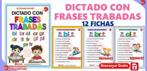 12 FICHAS DE DICTADO CON FRASES TRABADAS PARA NIÑOS DE PRIMARIA Los dictados de frases con sílabas trabadas (aquellas donde hay dos consonantes seguidas, como bl, tr,...