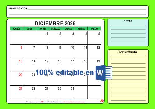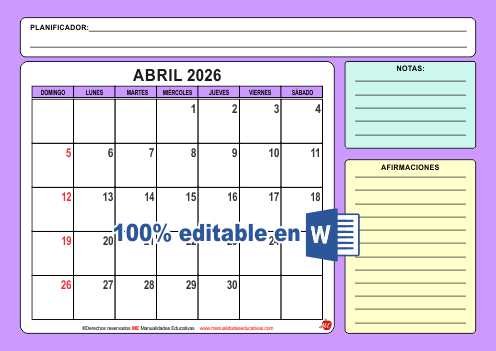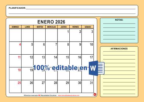 ORGANIZADOR MENSUAL 2026. Plantilla Editable en WORD.