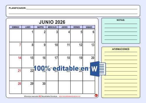 ORGANIZADOR MENSUAL 2026 DE TODOS LO MESES DEL AÑO. CADA ORGANIZADOR MENSUAL ESTA EN FORMATO WORD EDITABLE PARA MODIFICAR LOS FERIADOS DE TU PAIS Y PNER DE COLOR QUE RESALTE.