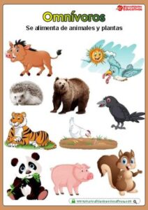 Omnívoros: Se alimenta de animales y plantas. La clase de animales protagonistas de esta lección. Son aquellas especies que se alimentan tanto de carne como de plantas, pudiendo ser tanto depredadores como presas.