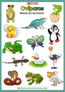 Ovíparos: Nacen de un huevo. Los animales ovíparos son aquellos que nacen de un huevo, por ejemplo: pollos, tortugas, gallinas, avestruces, pájaros, patos, cocodrilo, tiburón, guacamaya, pavorreal, peces, dinosaurios, sapos, insectos, cangrejos, serpientes, entre otros El huevo está formado por la yema, la clara, las membranas y el cascarón.