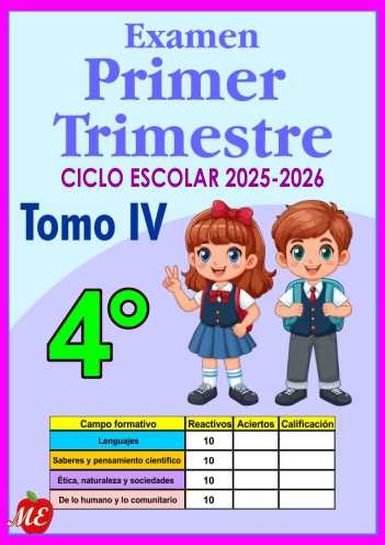 Exámenes del primer trimestre ciclo escolar 2025-2026 – Tomo IV. También examen de conocimientos. Estas evaluaciones son una herramienta de mucha importancia en el proceso educativo de cada grado y asignatura (áreas). Los exámenes diagnósticos se realizan por trimestre con el objetivo de evaluar el nivel de comprensión previo de los estudiantes en relación con los contenidos que se abordaron en las clases de agosto a octubre.