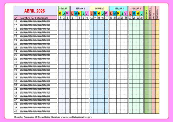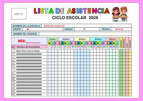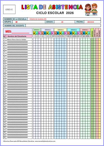 Lista de Asistencia Escolar para 35 a 40 Alumnos – Ciclo Escolar 2026