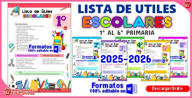 Formatos editables de materiales y útiles escolares para nivel inicial y primaria. Formatos elaborados por nuestro equipo Manualidades Educativas. Los hermosos formatos pueden utilizarlos para lista de útiles preescolar, primaria. Sólo necesitas descargar, guardar en tu ordenador, editarlo agregar información de la lista de útiles del grado que ocupa y los datos de la escuela y su lista de útiles 2025.