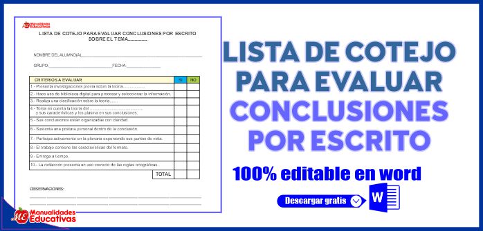 LISTA DE COTEJO PARA EVALUAR CONCLUSIONES POR ESCRITO SOBRE EL TEMA…. DOCUMENTO EDITABLE EN WORD. Descargar final del POST.