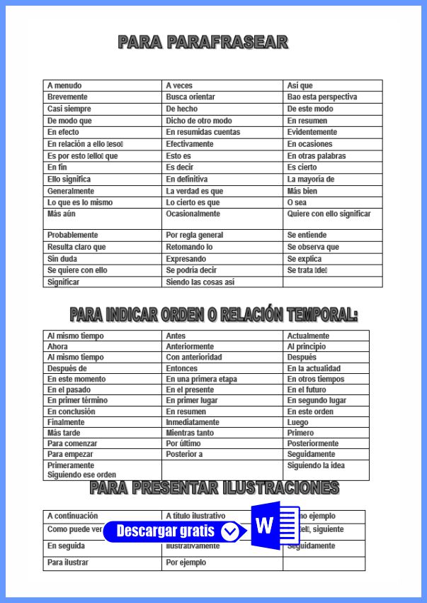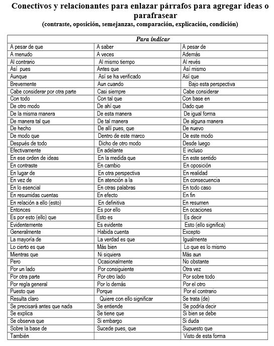 Conectivos y relacionantes para enlazar párrafos para agregar ideas o parafrasear
