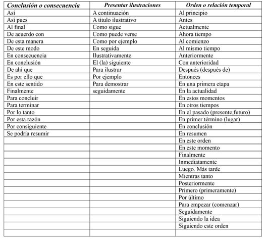 Hay lista de ellos de acuerdo con su función: ACLARAR, CONCLUIR, CONTRADECIR, INFERIR, ETC., para garantizar entre párrafos la secuencia lógica así como también entre las oraciones que comprende un párrafo.