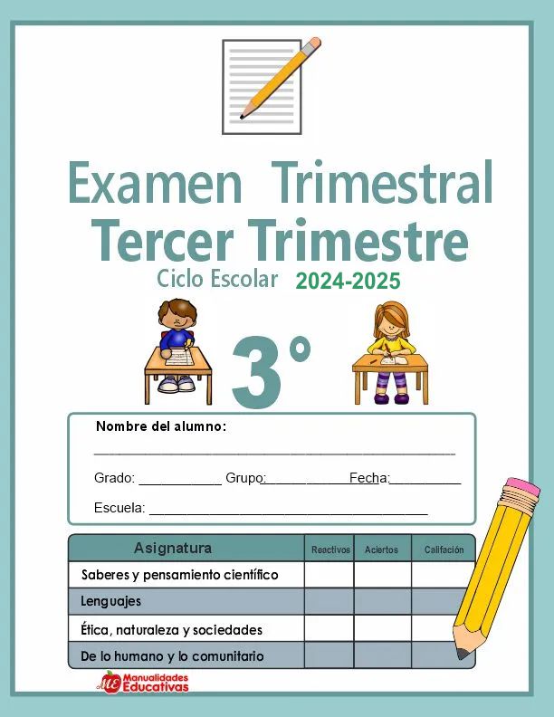 Examen Trimestral Tercer grado Tercer Trimestre 2024-2025. Se define como examen a la prueba final que se realiza para comprobar los conocimientos adquiridos en una determinada materia, dicha prueba la toma el docente a cargo.la evaluación en ocasiones es importante ya que se tiene la necesidad de saber cuanto han aprendido los alumnos. cabe destacar que el examen se puede realizar de varias formas como por ejemplo: oral, escrita, electrónico o en un entorno de pruebas físicas en un periodo de tiempo definido bajo la supervisión del maestro. Los exámenes pueden estar estructurados con preguntas abiertas, cerradas o de opción múltiple, las cuales exigirán el desarrollo académico por parte del estudiante. Compañeros maestros a continuación les compartimos los siguientes exámenes del tercer trimestre de educación primaria. Las preguntas que contiene el examen están dirigidas a evaluar al alumno para saber su nivel de aprendizaje.