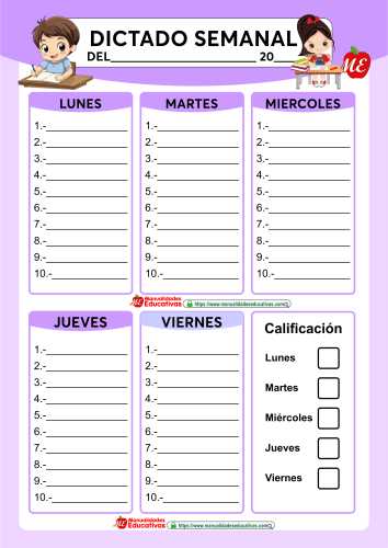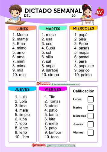 Útil y practico formato de dictado semanal. Se recomienda utilizarlo dentro del aula con los alumnos que no han consolidado su proceso de alfabetización. Solo imprime, enmica y utiliza marcador para pizarrón.. Por su fácil diseño y manejo podemos utilizarlo también como una estrategia de trabajo en casa.