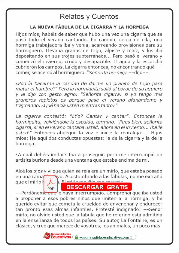 Fábula de La Cigarra y la Hormiga. Documento en PDF.