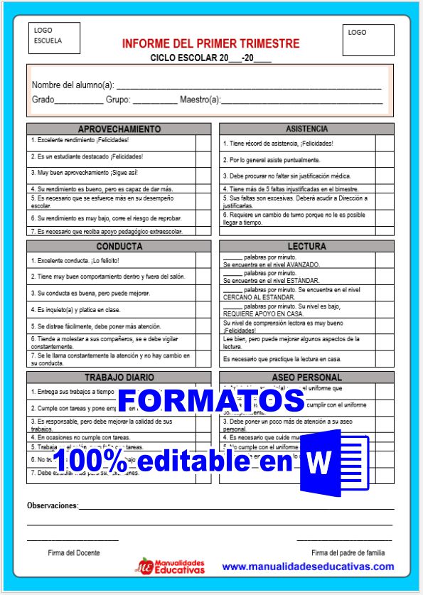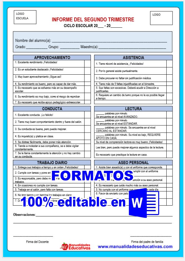 Hoy les compartimos excelente formato de informe para el Segundo Trimestre. Excelente informe para la primera reunión de padres de familia del primer trimestre del ciclo escolar información para poder dar a conocer a los padres de familia el desempeño escolar de sus hijos(as). Este documento se encuentra editable en formato word. Usted como docente puede modificar, agregar información y/o quitar.