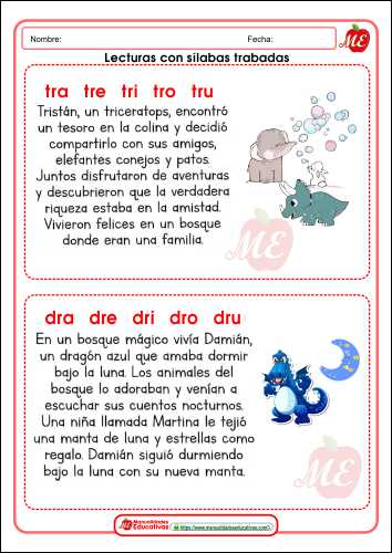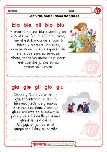 Las lecturas con sílabas trabadas son textos cortos diseñados para que los niños o estudiantes que están aprendiendo a leer practiquen la pronunciación y el reconocimiento de palabras que contienen sílabas complejas.