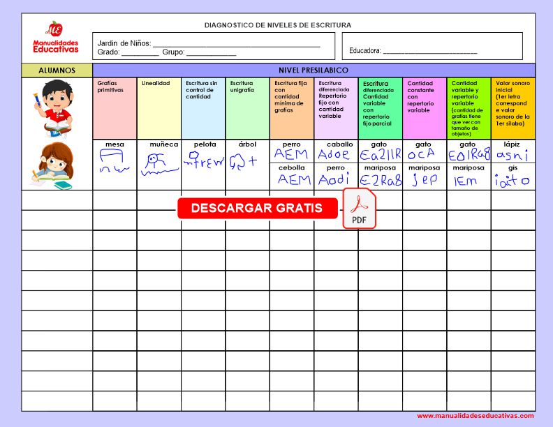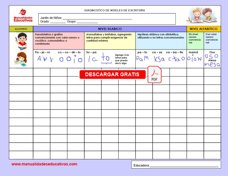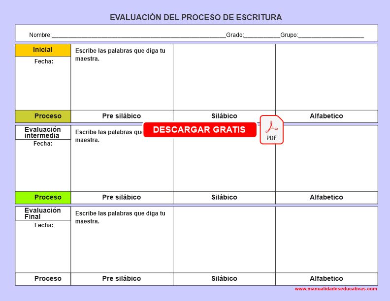 FORMATOS DE NIVELES DE ESCRITURA: DIAGNOSTICO DE NIVELES DE ESCRITURA Y EVALUACIÓN DEL PROCESO DE ESCRITURA. Archivo en formato PDF. Descargar final del POST.