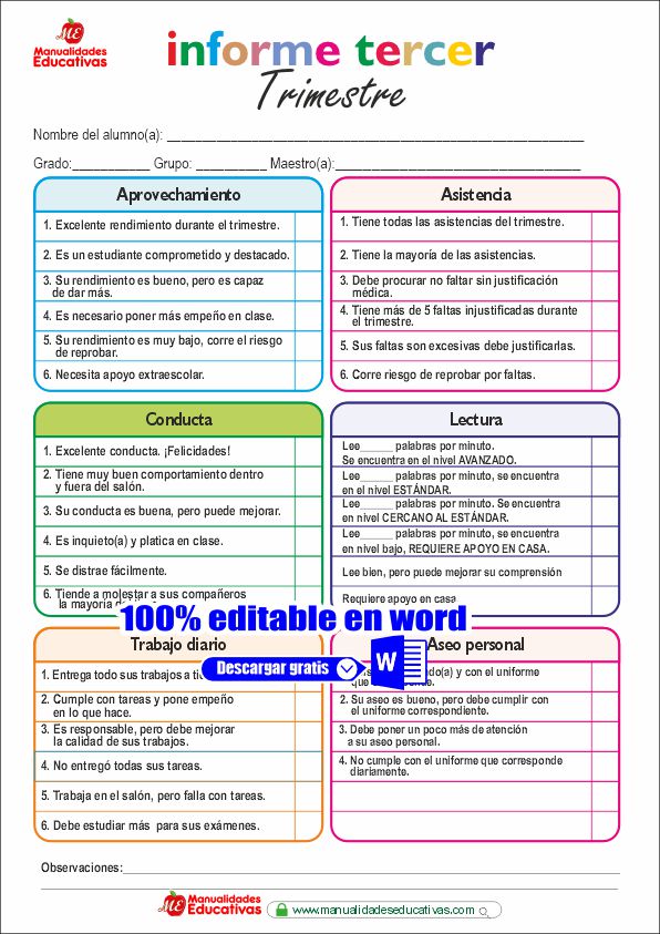 Hoy les compartimos excelente formato de informe para el Tercer Trimestre. Información para poder dar a conocer a los padres de familia el desempeño escolar de sus hijos(as). Este documento se encuentra editable en formato word. Usted como docente puede modificar, agregar información y/o quitar.