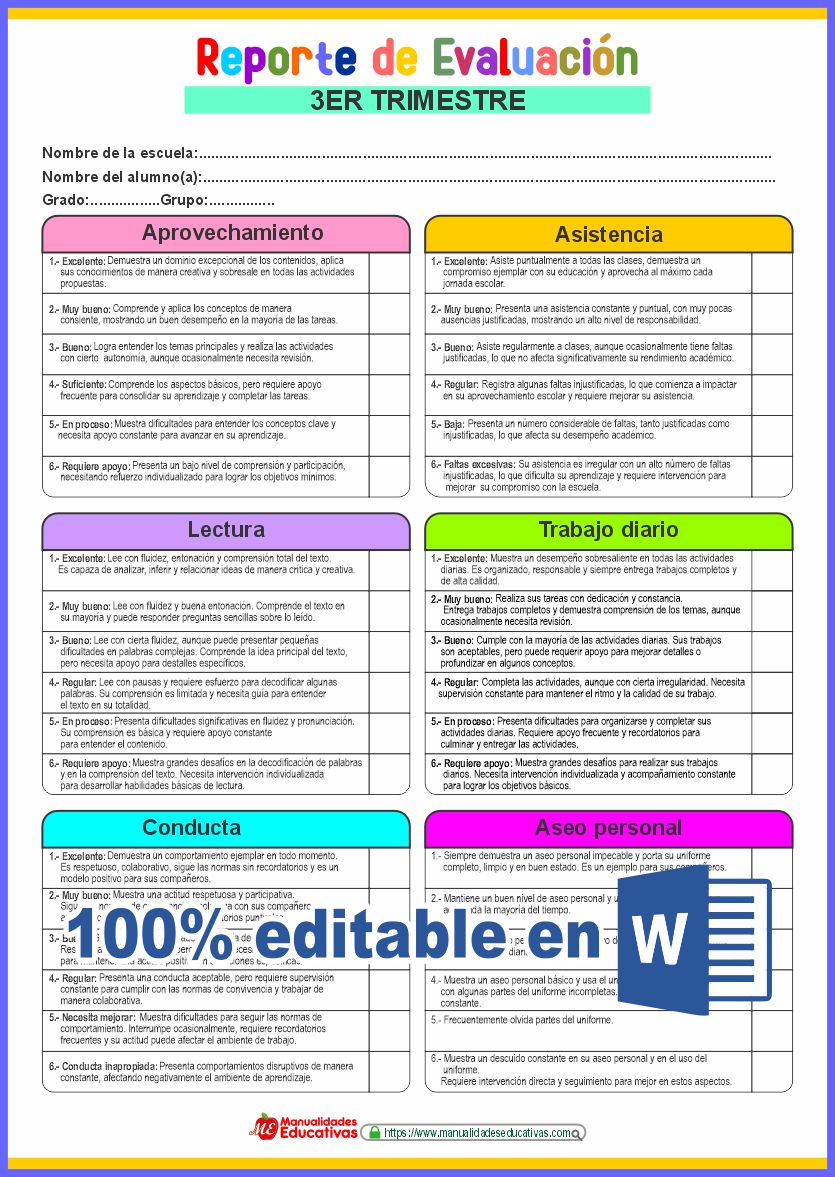 REPORTE DE EVALUACIÓN TERCER TRIMESTRE. Documento Editable en WORD.